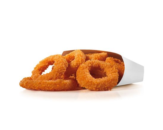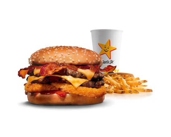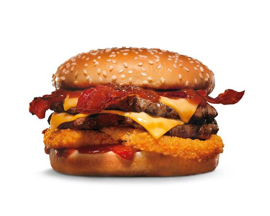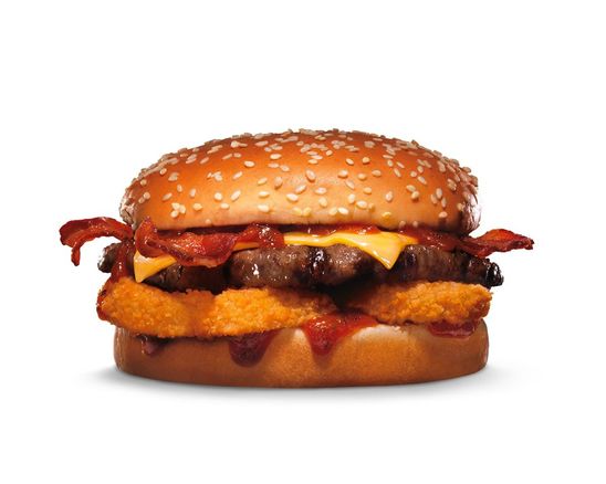 Un Double Western Bacon Chargrilled burger avec onion rings, servi avec un accompagnement et une boisson.