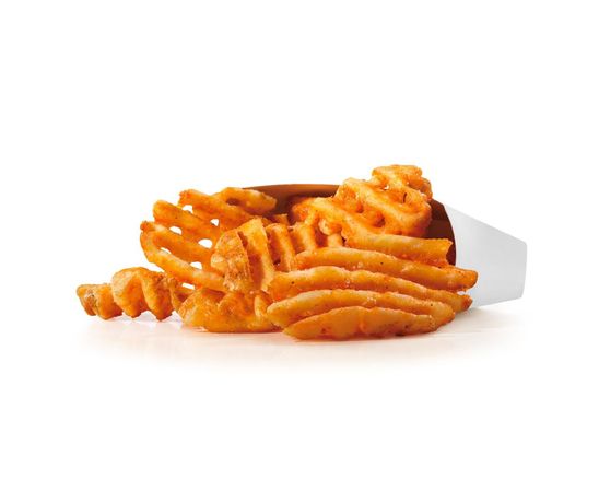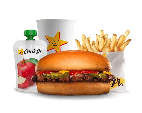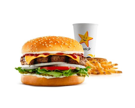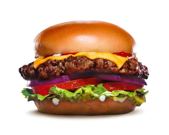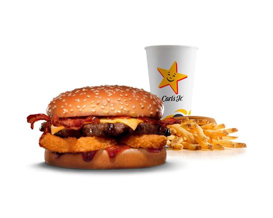 Un Famous Star Chargrilled burger, servi avec un accompagnement et une boisson.