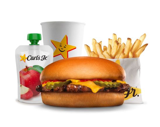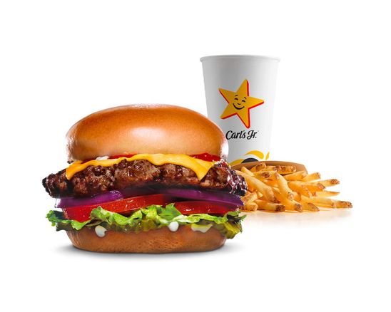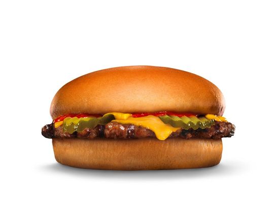 Un Cheeseburger, servi avec un accompagnement et une petite boisson.