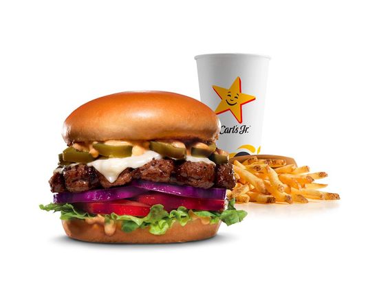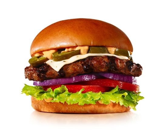 Un Jalapeño Spicy Big Angus burger, servi avec un accompagnement et une boisson.