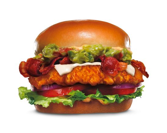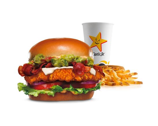 Un Guacamole Chicken burger, servi avec un accompagnement et une boisson.