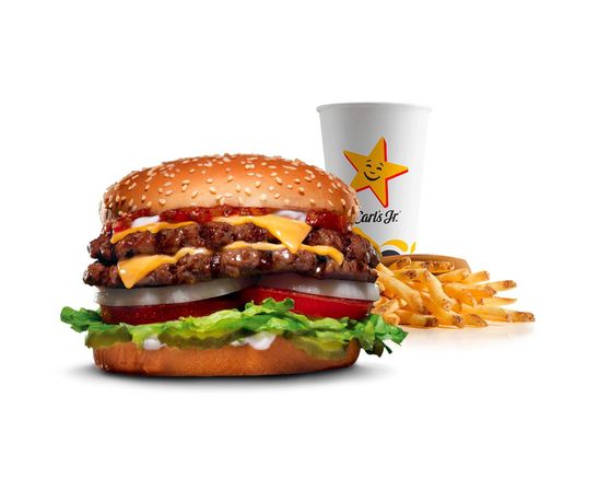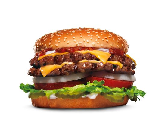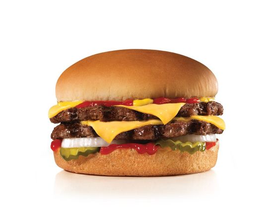 Un Double Cheeseburger Chargrilled burger, servi avec un accompagnement et une boisson.