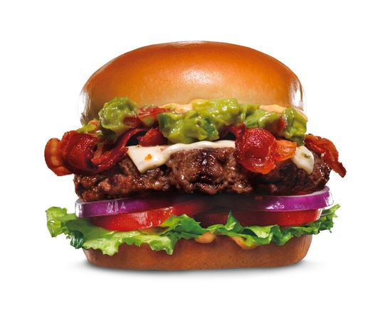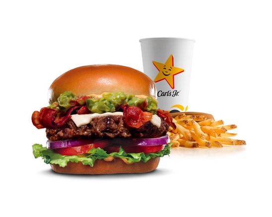 Un Guacamole Bacon Big Angus burger, servi avec un accompagnement et une boisson.
