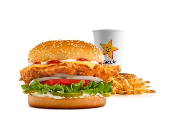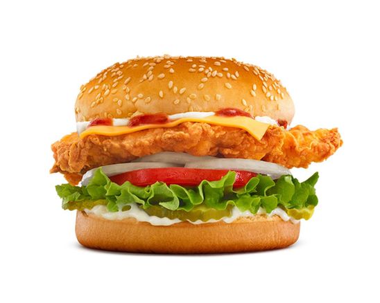 Un Chicken Filet Hand-Breaded burger, servi avec un accompagnement et une boisson.