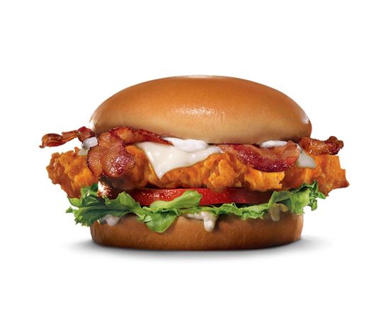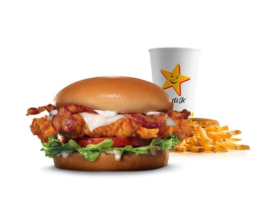 Un Bacon Swiss Crispy Chicken Hand-Breaded burger, servi avec un accompagnement et une boisson.