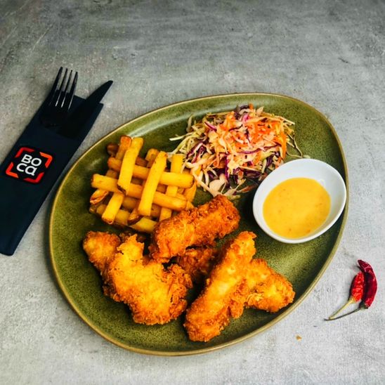 Blanc de poulet mariné & frit, coleslaw, frites , sauce miel moutarde
