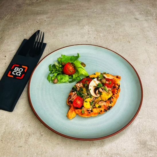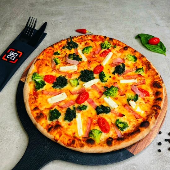 Jambon, fromage ricotta, tomate cerise, épinard, brocoli, mozzarella