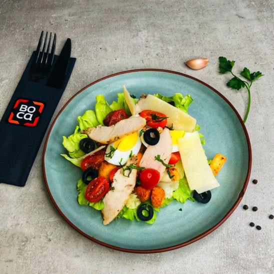 Salade romaine, blanc de poulet, croûton, ricotta, parmesan, tomate cerise, œuf poché