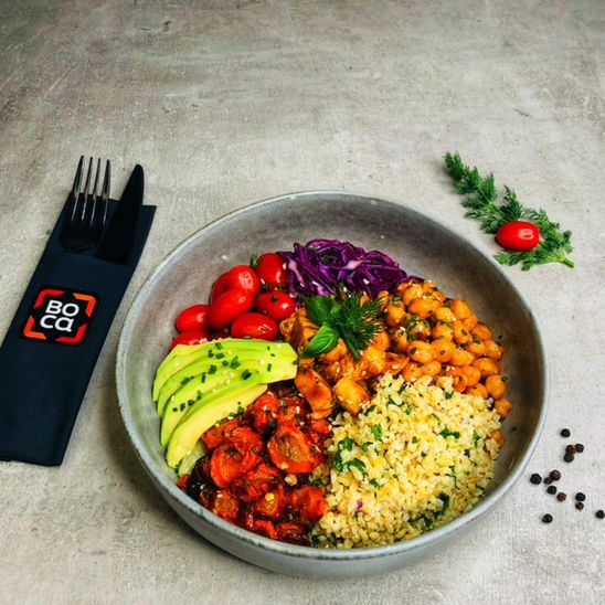 Blé, filet de poulet, avocat, choux rouge, pois chiche mariné, tomate cerise, carotte confite