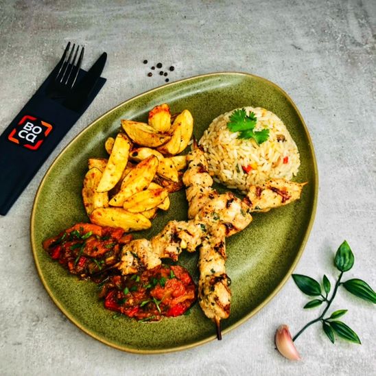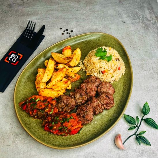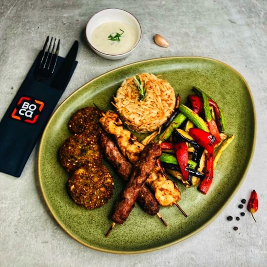 Kofta & brochette de poulet assaisonnées à la libanaise, accompagné de riz mangouch, légumes sautés & falafel avec leur sauce