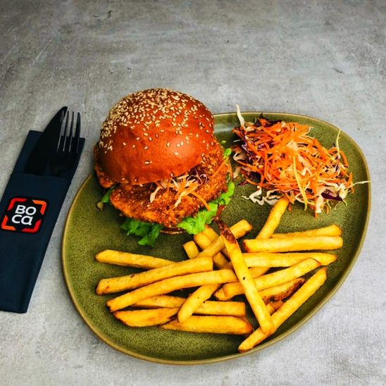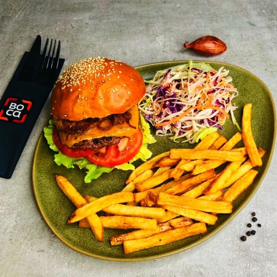 Viande hachée, fromage Cheddar, oignon caramélisé, laitue, tomate accompagné de coleslaw & frites
