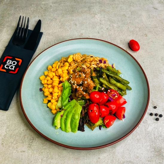 Avocat, blanc de poulet mariné à l'asiatique, riz assaisonné, haricot vert, mais & tomate cerise