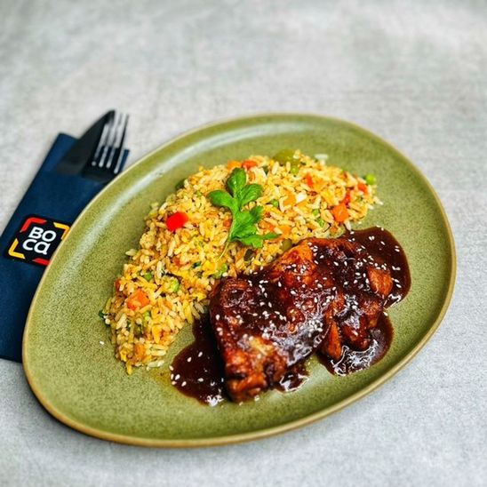 Haut de cuisse de poulet, accompagné de riz cotonnais