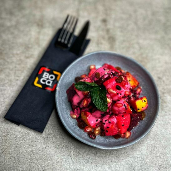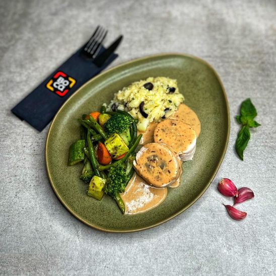 Salade verte, blanc de poulet, fromage Maasdam, haricot, concombre, jambon, œuf, tomate cerise, mais, olive noire