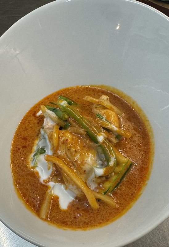 A hot and spicy Thai curry with a clear broth and bamboo shoots, baby corn, and Thai herbs. (cooked without co...