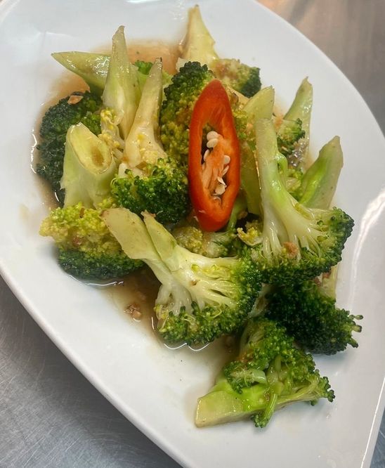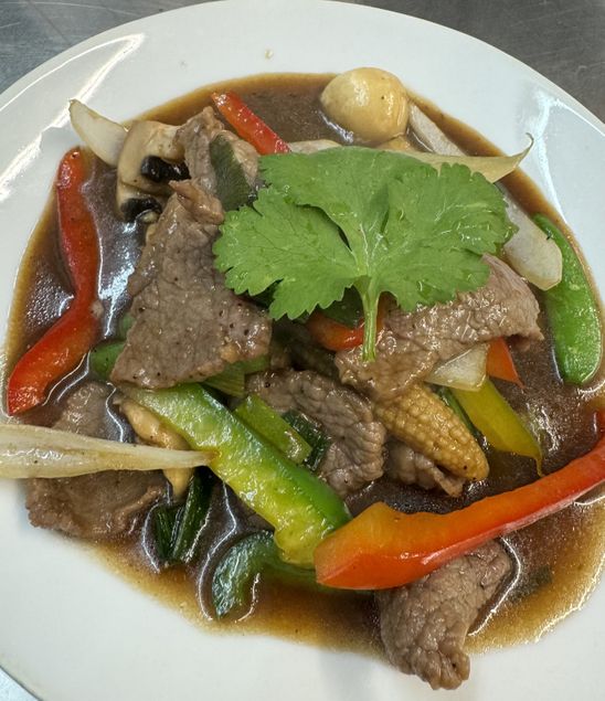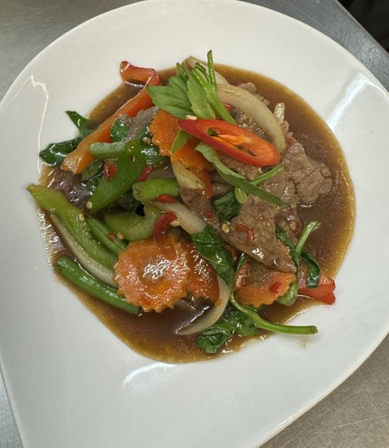 Stir fried slices of meat or vegetable in chilli and garlic. Topped with holy basil and green beans