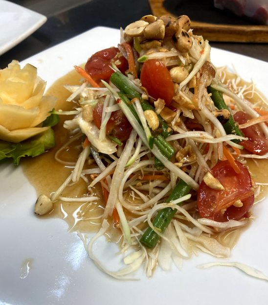 Spicy green papaya salad with carrots, green beans, tomatoes, chilli, garlic and topped with ground peanuts. C...