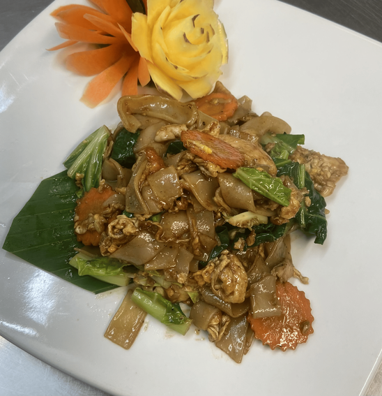 Stir fried Hofun rice noodle with green chilli, green beans, bamboo shoots,pepper, onions and basil leaves