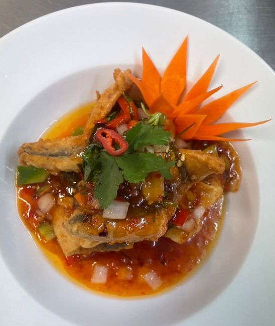 Deep fried seabass topped with the chef's special tamarind sauce and served with crispy shallots.