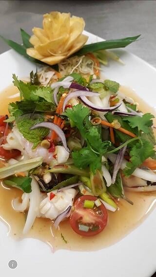 A mixed seafood salad including king prawns, mussels, and squid. Served with a special dressing made with lemo...