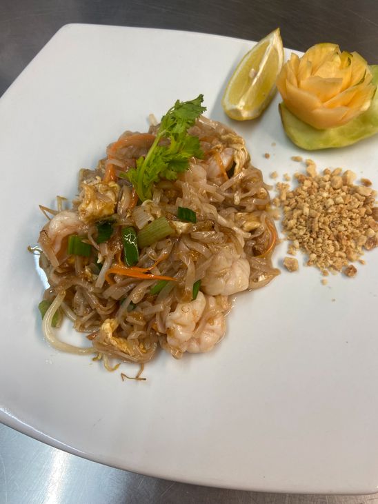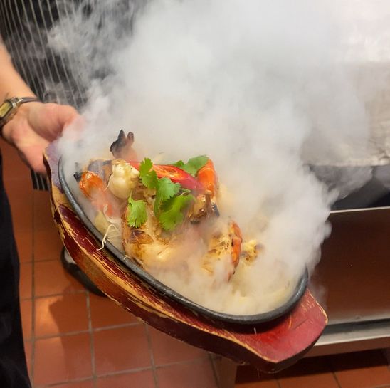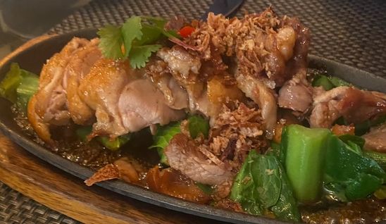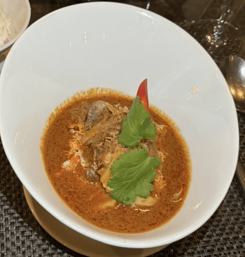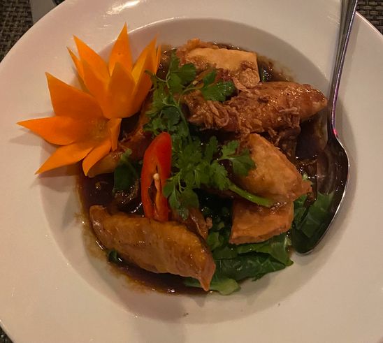 [STARTER] Aromatic Duck with Pancakes [MAIN COURSE] Massaman Curry with Chicken, Pad Chow Lay (spicy mixed sea...
