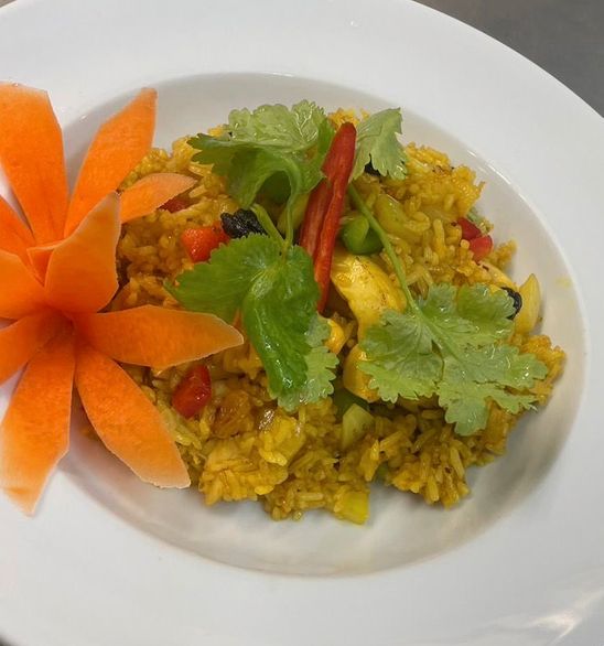 Fried rice with pineapple, dried raisins, onion, and curry powder. Contains cashew nuts