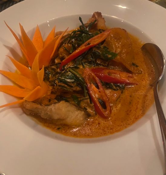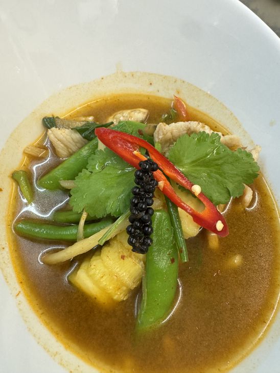 Seabass cooked in Chu Chee red curry paste with coconut milk and makrut lime leaves.