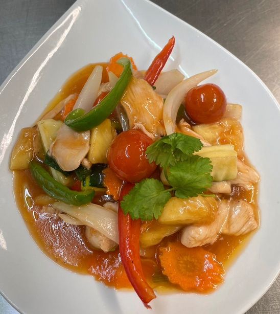 Thai-style sweet and sour stir-fry with cucumber, onion, tomatoes, pineapple and spring onion
