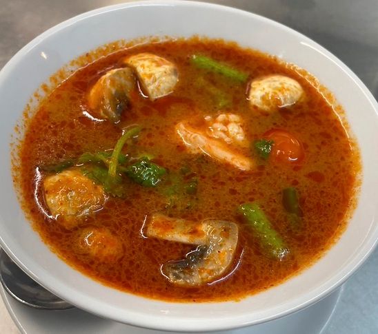 A sour and spicy mixed seafood soup with fresh Thai chilli, basil leaves, squids, mussels, and prawns