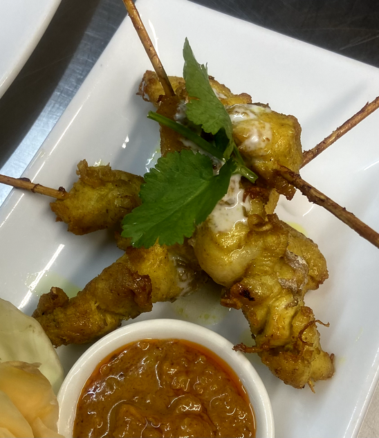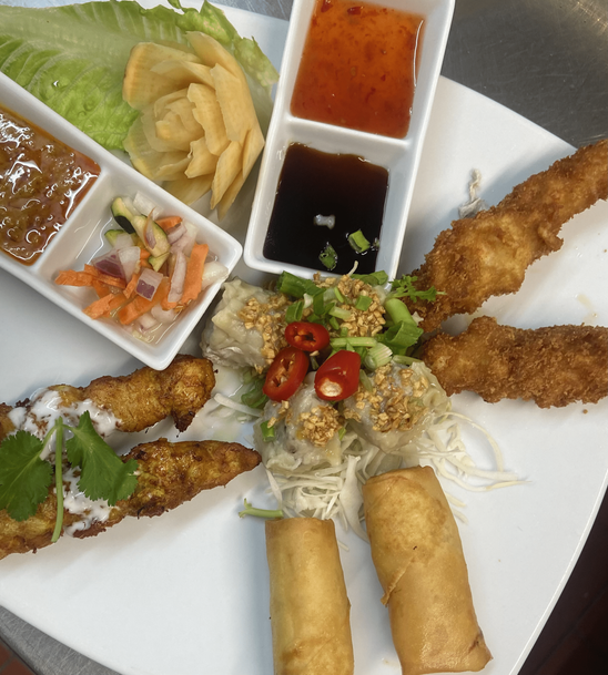 Combination of: chicken satay, prawn tempura, steamed Thai dumpling and vegetable spring roll. Minimum of 2 pe...