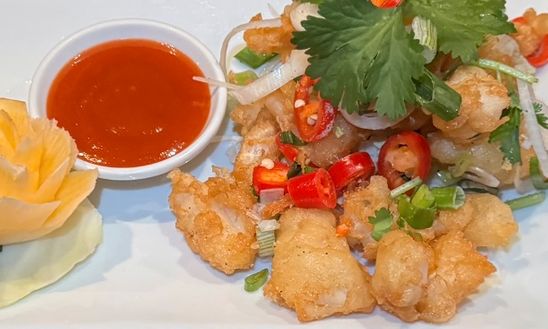 Deep fried squid in crispy batter with slices of fresh chilli and coriander. Served with a separate hot sauce