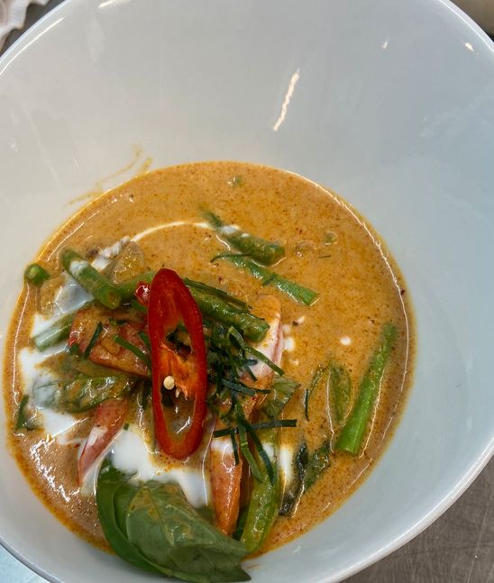 Thai red curry with bamboo shoots, courgette, and fresh chilli. Contains shrimp paste