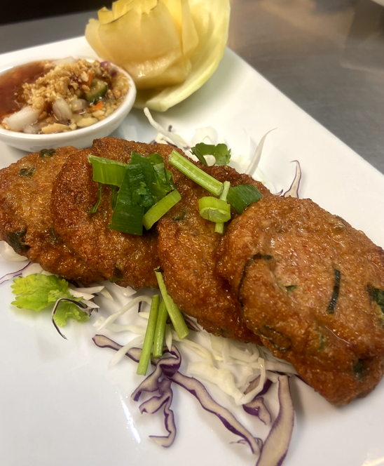 Homemade Thai fish cake. Made from Thai red curry paste with the combination of makrut lime leaves and green b...