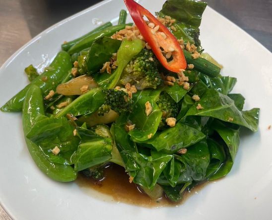 Stir-fried mixed seasonal green vegetables in garlic, including spring green, broccoli, and mangetout