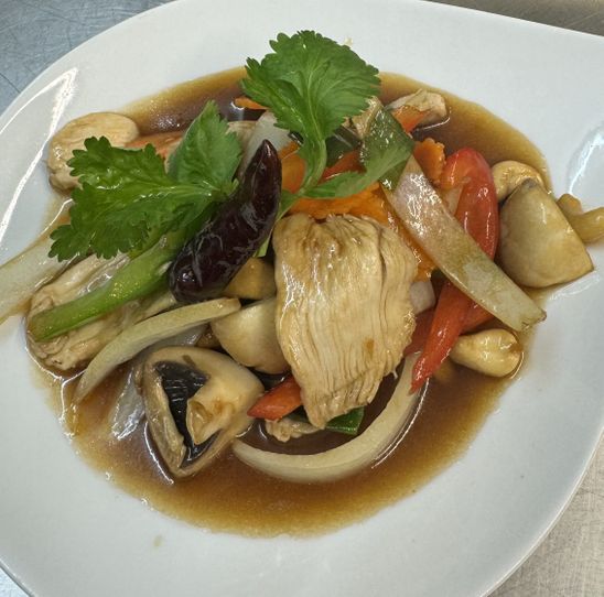 Stir-fry with ginger, onion, mushroom, and garnished with spring onion