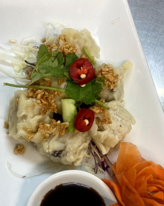 Steamed Thai dumplings made with a mix of pork and prawns, and water-chestnut