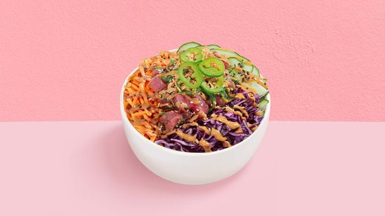 Riso Bianco, Tonno, Goma Wakame, Cavolo Rosso, Carote, Cetrioli, Salsa Ponzu, Salsa Spicy Peanuts, Peperoncino...