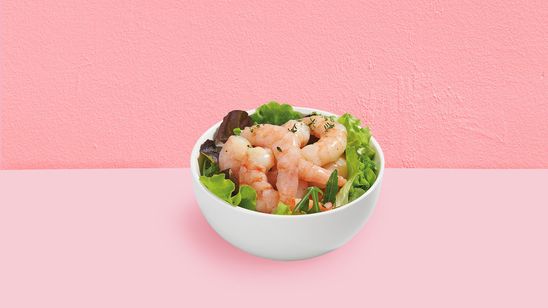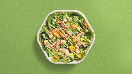 Misticanza con Olio e Sale, Mango, Edamame, Cetriolo, Avocado Hass, Gamberi Lime e Timo, Salsa Yogurt alle Erb...