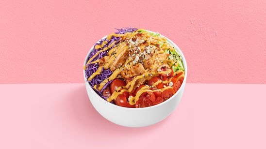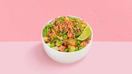 Riso Bianco, Sriracha Salmon, Avocado Hass, Edamame, Peperoncino Verde, Salsa Sriracha Drizzle, Cipolla Crocca...
