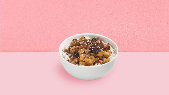 Riso Bianco, Pollo Teriyaki e Zenzero, Zucchine, Pomodorini Datterini, Cavolo Rosso, Salsa Teriyaki, Salsa Spi...