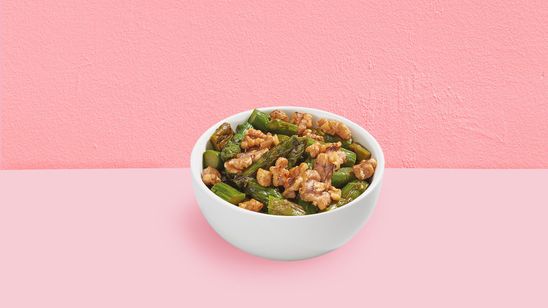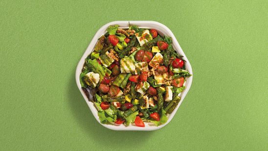 Misticanza con Vinaigrette, Avocado Hass, Asparagi Grigliati, Baked Halloumi, Pomodorini Datterini, Olive Rivi...