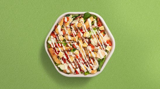 Misticanza con Vinaigrette, Grana Padano in Scaglie, Pomodorini Datterini, Pollo, Bacon, Crostini di Pane, Cre...