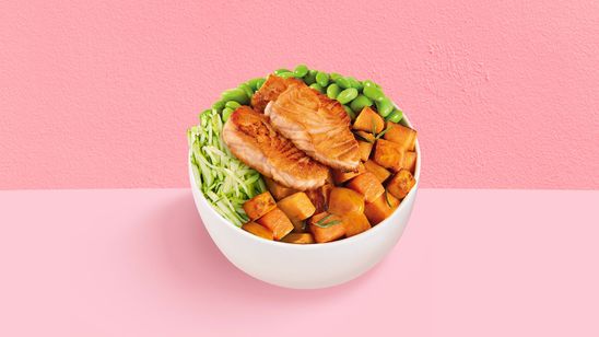 Spinacino, Riso Integrale, Filetto di Salmone Grigliato, Edamame, Patate Dolci al Rosmarino, Zucchine, Salsa M...