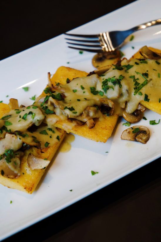Carrés de polenta sautés à la poêle et garnis de champignons et d’une savoureuse crème de pois chiches