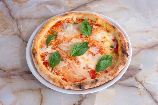 Sauce tomate avec es tomates pelées Mutti, burrata onctueuse, roquette fraîche, jambon de Parme et tomates c...