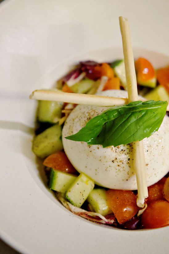Crémeuse burrata di Puglia posée délicatement sur un lit de tomates cerises,concombre et radis frais, accom...