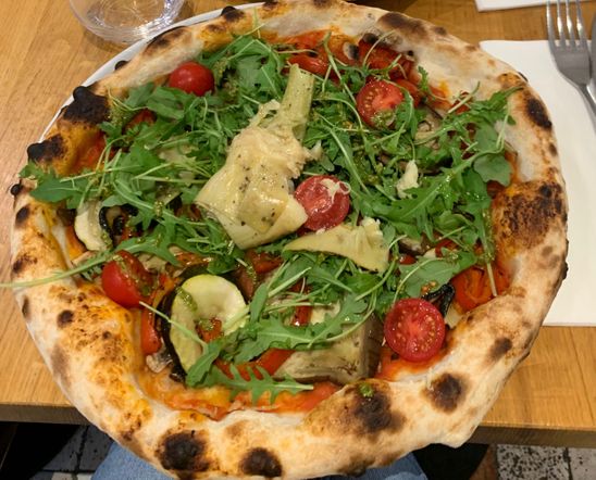 Pâte à pizza chaude et croustillante, surmontée d’ail, de romarin,de tomates cerises et de parmesan