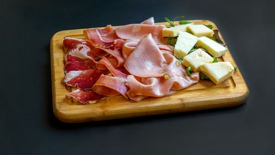 Charcuterie du maître charcutier Gambitelli, composée de jambon de Parme, de mortadelle aux pistaches et de ...