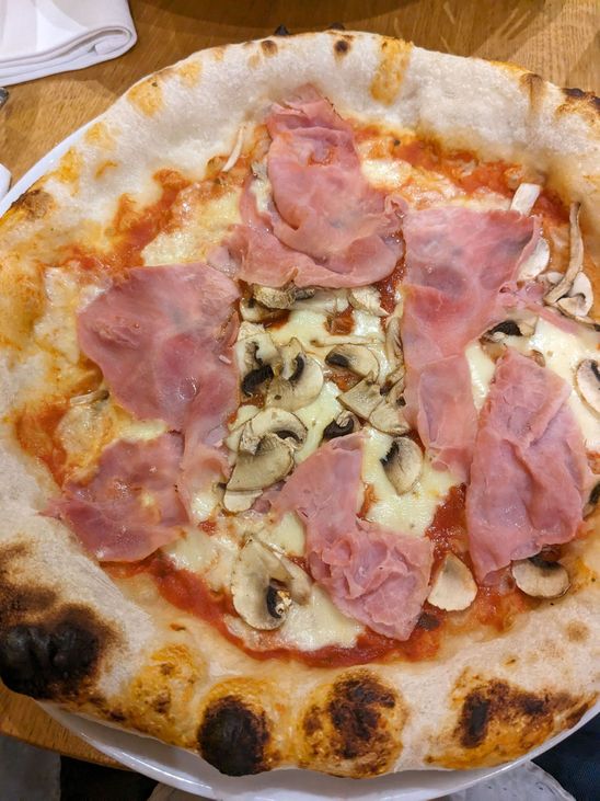 Jambon cuit italien, champignon sautés à l’ail et persil, sur une base de sauce tomate avec des tomates pe...