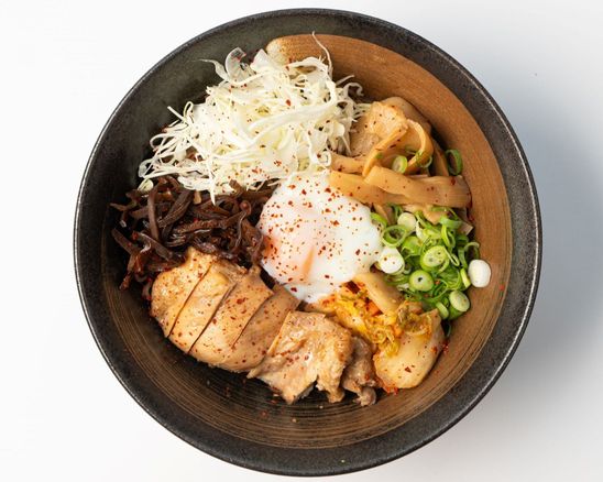 Brothless ramen with a thick and umami sauce, teriyaki chicken, kimchi, mushrooms, cabbage, perfect egg, scall...